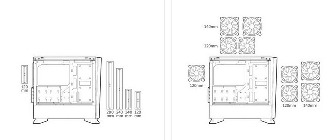 - Спереди: 120 мм x3 / 140 мм x2 (x2 120-мм вентиляторы ARGB предустановлены)