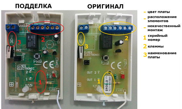 3. Крім неякісного монтажу елементів відразу помітна різниця в кольорі плат: колір плати оригінального приймача Elmes Electronic ― однотонна, світло-зелений. Найменування плати ― RH2F. На платі внизу обов'язково повинна бути наклейка з серійним номером приладу. Також потрібно звернути увагу на клеми і загальне розташування елементів на платі, яка у оригіналу і підробки також не збігається.