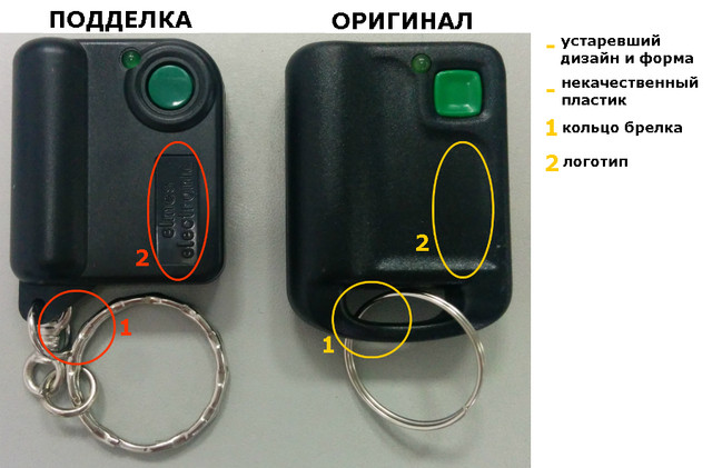 4. Форма підробленого брелока-передавача ― застарілі. Elmes Electronic модифікували дизайн брелків. На лицьовому боці оригінального брелока немає логотипу компанії.