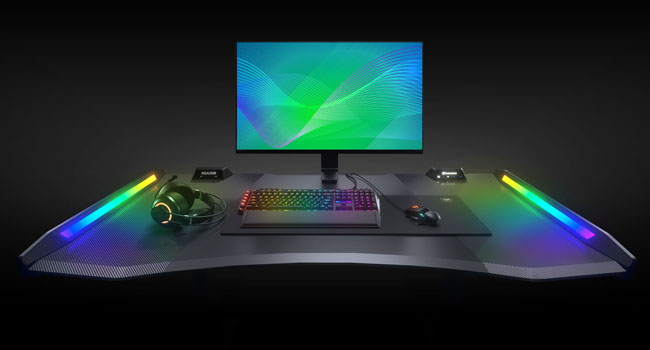 Понад 150 сантиметрів ігрової поверхні, з текстурою з вуглецевого волокна, дадуть змогу розмістити кілька моніторів, клавіатуру та інші ваші ігрові аксесуари. Вигнуті краї та закруглені кути столу дадуть вам змогу отримати абсолютно новий ігровий досвід.